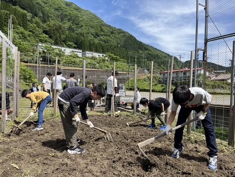 今日の4・5限目の授業は里山インストラクターの小寺さんの指導のもと、畑の土づくりを行いました。グラウンドの片隅にある畑の大きさは約5坪(1坪が畳2枚分)。雑草が生え放題だったため、まずは草を抜くことから始めました。草を抜き取ってはリヤカーで運ぶという作業を中学生全員で行い、汗だくになったところで、やっと畑の土があらわれました。よ〜し、これで苗を植えられるぞ!と思いきや、雑草の根が奥深くまで蔓延(はびこ)っているため、鍬で根を掘り起こさなければなりません。この作業が思った以上に大変!畑の土をふかふかの寝床にするには、時間をかけて土を耕さなければならないことを身にしみて感じた本日の活動でした。苗付けは6月の予定です。