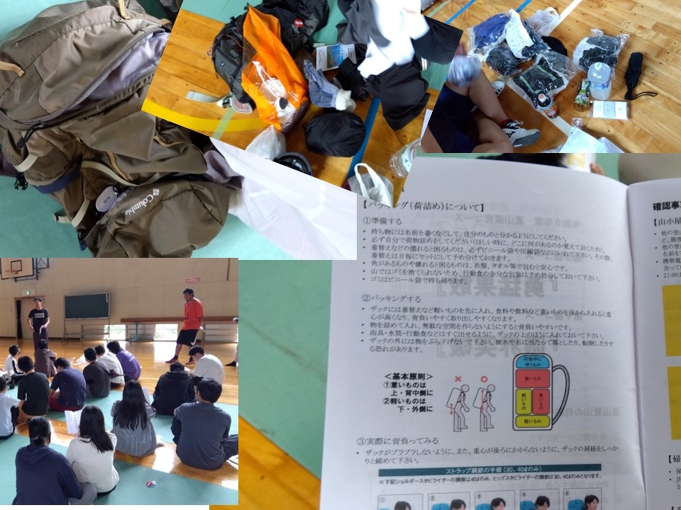 先週、夏山実践コースに向けての荷物チェックをしました。旅行ではなく登山なので、必要最小限のものだけを持って行かなければいけません。また、必要だけどかさばるものは出来るだけかさを少なくしたり、軽いものを下、重いものを上にパッキングして、準備万端で出発を待っていました。当日を楽しみにしていましたが、台風接近のニュース。色々な対応を検討しましたが、やむなく8月下旬の実施は見送ることとなりました。残念!