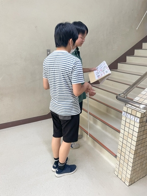 普段何気なく移動している校舎内ですが、視覚障がい者役の生徒は介助者がいて白杖を持っているとはいえ、目を閉じて歩くのは不安に感じたと思います。また、介助者役の生徒も階段などの場所はプリントを確認しながら誘導をしていました。場面によっては工夫や気を遣わないといけないことがわかったようでした。どちらの立場も体験することができた貴重な授業でした。