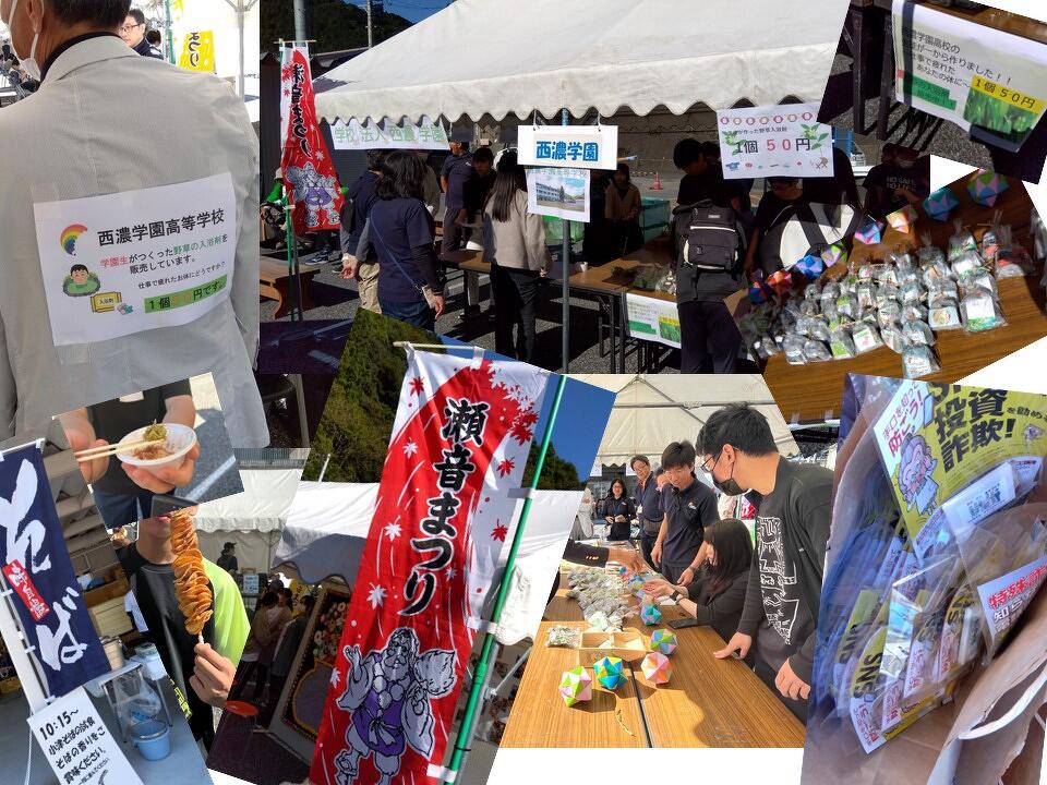 瀬音祭りは、瀬音(水のせせらぎ音)を聞きながら、この風光明媚な地域に親しんでほしいと、清流いび川と、日坂川、小津川に沿う8つの集落の願いが込められたイベントです。そんなイベントに西濃学園も出店を出して、高校3年生が自分たちで作った野草から作った天然の入浴剤を販売しました。午前中だけであっという間に完売。そのあとは、ふるまいのそばを食べたり、揖斐署の防犯グッズを配布したり、各ブースめぐりをしたりして愉しんできました。