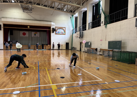 風船の周りに6枚の大きなオセロを散りばめます。風船が上がっている間にオセロを全てひっくり返します。全てひっくり返したら次の子とバトンタッチ。これをリレー形式で行い、どのチームが一番早くできるか競い合いました。