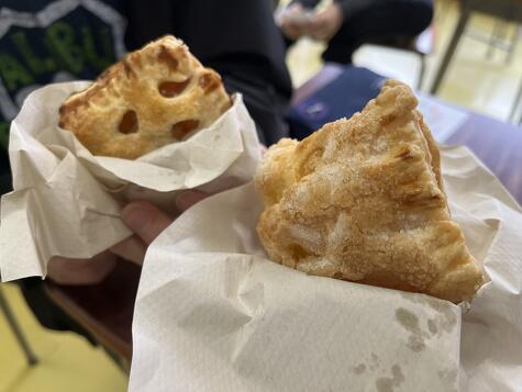昨日から夏山登山の下見に職員が出掛けています。そのため、理科と保健体育の授業が家庭科になりました。午前中にリンゴを電子レンジで加熱して甘煮を作り、午後から冷凍パイシートで包んでオーブンで焼き上げました。5限が終わる頃には1階の食堂から2階の職員室までアップルパイの甘い香りが漂ってきました。中3の生徒たちが「アップルパイ、どうぞ〜」と職員にも届けてくれたので、職員もいただきました。明日には下見の職員が帰ってきます。山の話が楽しみです!