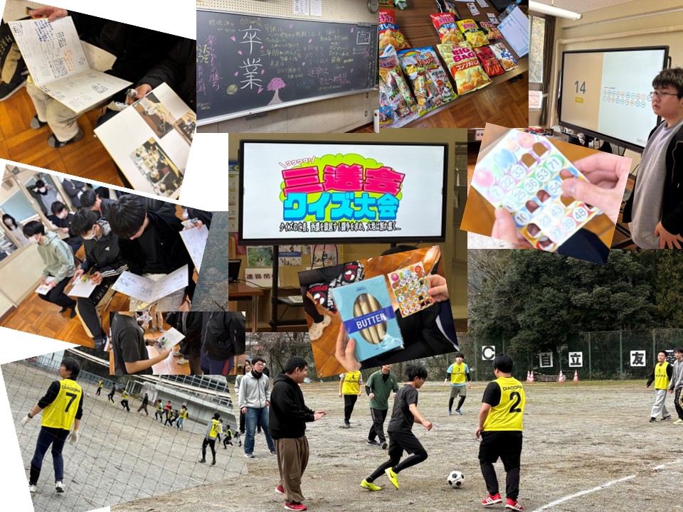 高校2年生が中心となって、高校3年生を送る会が行われました。卒業式のリハーサルを終え、昼食でおなかも満たされたところで、まずはグラウンドにて高3生対高2・高1生によるサッカーのミニゲームがスタート。白熱した試合は互いに譲らず、勝負はPK戦へ──。結果は……高3生が後輩に華を持たせてくれました。その後はサッカーの疲れも見せることなく校舎に戻り、ビンゴやクイズで大盛り上がり。後輩たちからのプレゼントに、会場は少ししんみりとした雰囲気に包まれ、体も心もあたたまる三送会となりました。そして、いよいよ卒業式です。