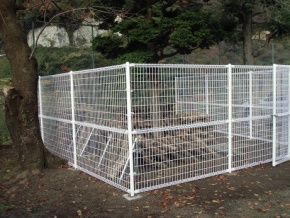 イビデンの森活動のシイタケ栽培。現在学園の校庭に置いてある原木を野生の動物から守るために立派な柵が出来上がりました。これで安心、すくすくと成長しているシイタケを見ているととても嬉しい気持ちになります。