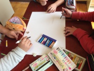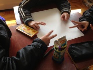 その後の「共同絵画」では、中2男子、女子、中1男子の3チームと、特別参加のスタッフチームで協力して、1枚の絵を描きました。どんな絵にするかをチームで考える時も、無言で伝えることがルールでしたが、相手になかなか伝わらず、ゼスチャーも交えて何とか伝え、絵が仕上がりました。