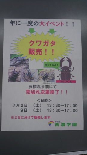 今年は、7月2日(土曜日)と7月9日(土曜日)の2日間、道の駅藤橋にあります「揖斐川温泉 藤橋の湯」さんのご好意で、温泉前にてクワガタ販売を行います。 このイベントは高校生の課題研究の一環として、生徒達自ら、採集、飼育、宣伝、販売まで行います。既に、50匹以上のクワガタを朝と夜に捕まえて、飼育しています。生徒たちは、どうすればたくさん捕まえられるのか、いかに安く虫かごや餌などを仕入れられるか、などを研究しながら取り組んでいます。 当日はみなさん、ぜひ、お越しください。