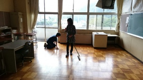 中学は、昼食後のお昼休みに、「清掃」を、生徒22名を4グループに分けて、校舎の各場所(曜日によって違う場所)をしています。