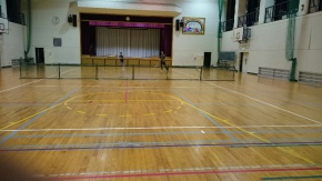 授業後、高校1年M君と職員2名で、藤橋学舎体育館で、ソフトテニスをしていました。 ネットは、体育館で使用している卓球用のボール保護ネットを代用しています。 他の希望生徒がいれば、部活動になりますね。