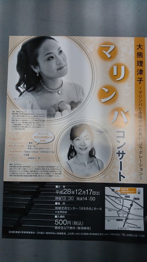 今日は学園で過ごす今年最後の週末でした。生徒達は、買い出しに出かけたり、ゲームをしたりするなどして午前中を過ごし、午後からは、希望した生徒達が揖斐川町の「はなもも」ホールで行われたマリンバコンサートに出かけました。マリンバとは木琴の一種ですが、あたたかく、落ち着きのある音色が特徴です。 生徒達にとって、聞きなじみのない楽器でしたが、最後にはマリンバと合唱とのコラボレーションに魅了されました。