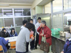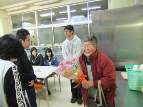 夕食前4人の生徒が一人ひとり「美味しい食事を作っていただきありがとうございました。」とお礼を述べ花束を贈呈しました。