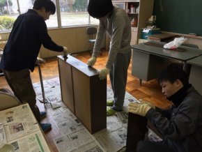 三年生の授業日も残り少なくなってきました。 三年生は卒業制作として、長瀬校舎のフリースペースにみんなで歓談できる場所を作ることになりました。 そこには漫画や小説を置こうということになり、その本棚のペンキ塗りを行いました。 みんな一生懸命作業していました。 評判のいい場所になるといいですね。