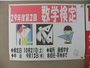 今日は台風が近づく中、数学検定が行われ、中学生5名が受検しました。来週日曜日の文化祭を控え忙しい中、勉強してきた成果がでるといいですね。