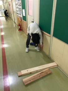 今日の藤橋は昨日とは打って変わって、あたたかくとても良い天気です。 今年度も中学の木曜の午後は、技術と家庭科の授業を1.2年生と3年生に分かれて隔週で行っています。今日は3年生が技術の授業で腰板を貼っていました。二人一組で協力しながら、それぞれ頑張っています。