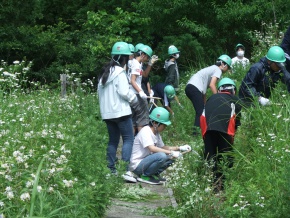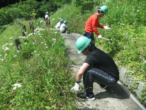 今日は、イビデン株式会社の管理する「道の駅藤橋」裏山周辺の下草刈りの活動を、梅雨の合間の曇った天候で行いました。本来の活動日は今週23日ですが、この日は学園では一斉帰宅のために、今日実施しました。 毎年、この時期は植樹した樹木のために、周辺の下草を職員、生徒合わせて56名の参加で約1時間半の活動でした。