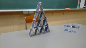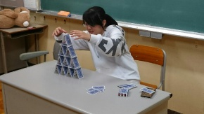 いよいよ、今月27日は文化祭です。今回の帰園で、文化祭の準備が始まります。そんな帰園の日に、夕食前に2学期から学園に転校したIさん(中2)は、ひとりで教室でトランプピラミッドに挑戦していました。Iさんは、神奈川県出身です。帰宅前に学園での初めての定期考査(中間考査)を受けて、心機一転とても頑張っていました。文化祭では、司会にも意欲的に取り組みます。トランプピラミッドは完成しました。すごい集中力です!