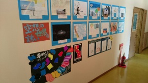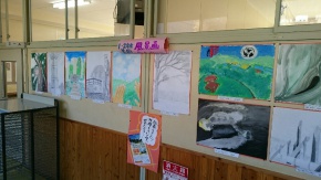 学園の中学校がある藤橋学舎の廊下は、生徒たちの美術作品が勢揃いです。関ヶ原の風景、版画、デザイン画などの作品が数多く展示してあり、とても見ごたえがあります。10月から多くの見学者の方々が来校されていますが、見学する最中に、その作品に目を奪われて見入っている姿も見られます。 保護者の方々も、来校の際には、是非一度ご覧下さい!