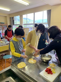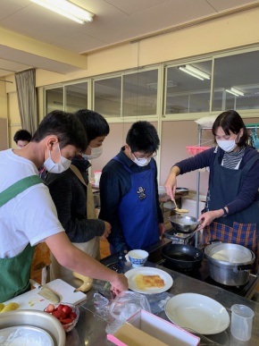 今日の5.6時間目、中学1.2年生の家庭科の授業でクレープを作りました。 包丁の使い方がたどたどしかったり、クレープの皮を薄くのばして焼くのに苦戦していたり、それぞれの性格が出ていて面白かったです。自分で作ったクレープは、より一層おいしく感じますね。