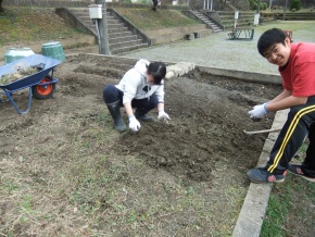 中学3年生のN君とTさんが卒業制作ではありませんが、学校の敷地内にある畑の整備をしてくれました。この1ヶ月間、こつこつと少しづつ土を掘り返し、ゴミひとつない畑にしてくれました。N君は本校の技能連携校に進学してからプチトマトやきゅうりを植えてくれるそうです。収穫が楽しみですね。