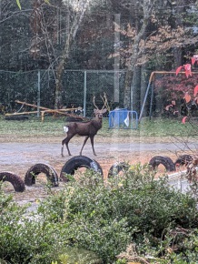 今朝、立派な角を持った牡鹿が悠々とグラウンドを歩いていました。慌てて職員室から写真を撮ると、小さなシャッター音に気がついたのか、写真を撮った瞬間こちらと目が合い逃げてしまいました。鹿には驚かせてしまって申し訳なかったのですが、思いがけない遭遇に朝からテンションが上がってしまいました!