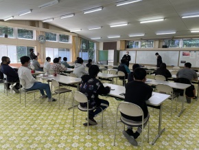 自衛隊の広報担当の方に来ていただき、自衛隊の仕事内容などの説明を受けました。
