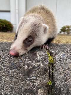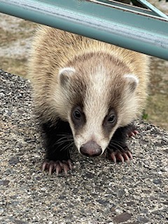 おそらくアナグマかハクビシンでしょう。なかなか人を恐れず、のんびりと校庭付近を歩いていました。近所で犬を散歩している方もやってきましたが犬にも怯えないので皆驚いていました。野生動物はけがや感染のおそれがあるので不用意にさわってはいけませんが、離れて見る分には可愛らしいものです。写真は生徒がスマートフォンで撮った物です。