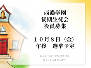 9月も終わりに近づき、二学期制の高校は前期の終わりが近付いてきました。 コロナの分散登校で、また来週からは、高一・高二が自宅待機のオンライン対応になります。 そんな中、後期の生徒会役員の募集が始まりました。 高い志を持った役員に、コロナ下であっても、より良い学校生活が送れるように頑張ってもらいたいです。