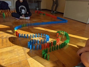 中学1年生の授業です。 中1の教室は日当りがよく、生徒たちは床に座って、思い思いに、あるいは協力しながら、ドミノを作ったり倒したりして、楽しみました! コミュニケーションってって楽しいなっていう体験がたくさんできるとうれしいな、と思って授業をやっています。