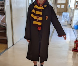 学園にハリーポッターが出現! とても似合っています。 USJで購入した衣装だそうですが、彼は、防寒対策として着てみたそうです。 でも、魔法も、藤橋の寒さには効かなかったみたいです、笑。