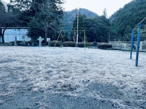 学園車のフロントガラスも凍り付き、グランドのブランコ周りは一面霜柱。