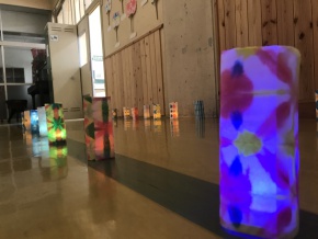 中1の美術でランタン作りをしました。 今日、完成していたランタンを廊下に並べて点灯しました。 あまりにも綺麗だったので、みんなで写真撮影を行いました。 こちらのランタンは4月にクラウドファンディングの返礼のイベントにも使用したいと思っています。