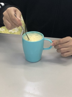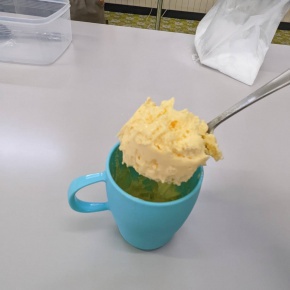 アイスクリームができあがりました。 今日の実験では、「固体が気体になるときに物質の熱を吸収する」という性質を利用し、ドライアイスを使ってアイスクリームを作りました。夏にぴったりな、涼しい(?)実験でした。