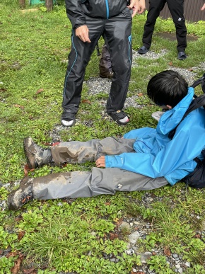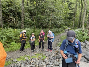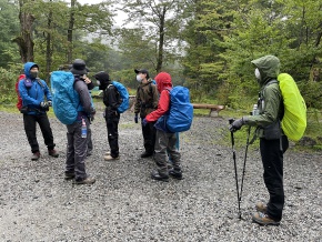 2日目は、各コースに分かれて登山をします。 蝶ヶ岳コースは、朝6時に徳澤園を出発していきました。 徳本峠コースは、天候不良のため、当初の予定から変更をして、屏風岩が見えるところまで歩くことにしました。 雨が降る中の登山となってしまいましたが、足元をみれば、みんな頑張って歩いていたんだなということがヒシヒシと伝わってきます。