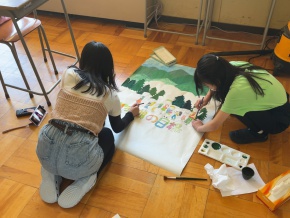 中2の生徒たちが、教室に掲示する1学期の目標を作成しています。なんと夏山登山をイメージしたイラスト入り!今日は色塗りの日だそうで、様々な色の絵の具を用いて色を塗っていました。木々が細かく塗られていたり、「1学期の目標」の文字の部分がグラデーションになっていたりして、とてもきれいでした。完成が楽しみです!