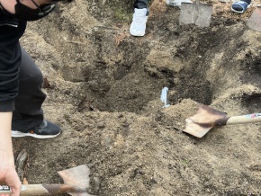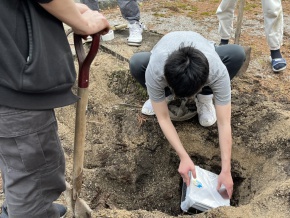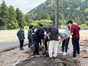 久瀬校舎の片隅に集まる高2の生徒+担任。みんなで穴を掘っています。