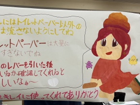 トイレのポスターを中学2年生の生徒が描いてくれました。こんなに明るいう○この帽子を被った魔女は見たことがありません。色のグラデーションも素敵。オシャレなイヤリングのシルエットにも注目!トイレに居ながら、何だか楽しい気持ちになリますね。みなさん、トイレのマナーに気をつけましょう!