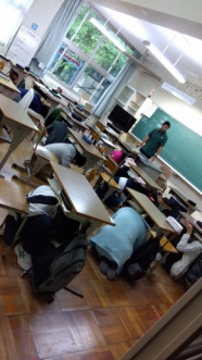 高校では本日、避難訓練が行われました。 地震と、それに伴う火災を想定した訓練です。 地震発生のアナウンスとともに、まずは机の下へ。 そして火災発生のアナウンスで避難。 学校内の避難経路・避難場所を確認しました。