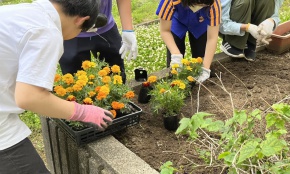 園芸部の生徒たちが、藤橋校舎の花壇を綺麗にしてくれました。 生えていた雑草を抜き、土を耕し、マリーゴールドを植えていきます。