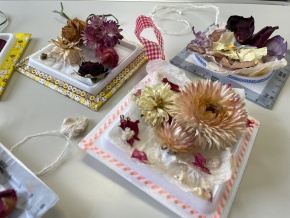 1年生の家庭科で、廃材を使って作品制作をしました。作品の土台になっているのは、納豆パックのふたです。ふたをマスキングテープやドライフラワーで飾り付けをしています。 4月に2年生も同じ作品を作っていますが、春らしい色彩の花が中心でした。今日の作品は深みのある色彩で秋らしい雰囲気に仕上がっています。どの作品も素敵です!