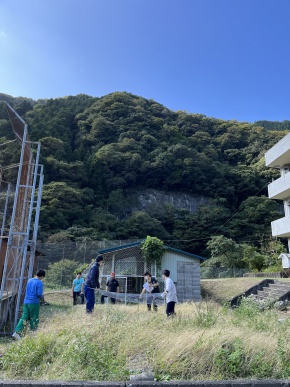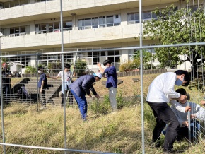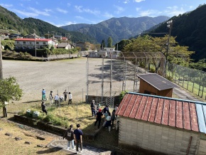 本日の午後は「森と木と水のこども会議」事業の一環で、畑の獣害対策用の柵を作りました。校舎南側の畑に支柱を打ち込み、金網で四方を囲んだ後、結束線でくくり付けていきます。学年ごとに役割を分担し、みんなで力を合わせた結果、何とか2時間で終わらせることができました。すばらしいチームワークです! 来週はこの柵に木とネットを組み合わせて完成させる予定です。