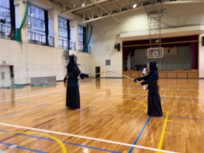 「めーーーーーーーーん!!!」 夕方、藤橋校舎の廊下を歩いていると、体育館から大きな声が聞こえてきました。中を覗いてみると、Hさんが職員と一緒に剣道の稽古に励んでいました。 Hさんは剣道1級の審査を受けるそうです。合格に向けて頑張れ、Hさん!
