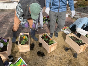 今年度も「森と木と水の環境教育支援事業」の助成を受けて、高校1年の家庭科などの授業で活動をしてきました。今日は、先日の授業で間伐材で作ったプランターに花などの苗を植えました。 ビオラ、パンジー、いちご、そら豆などたくさんの苗から好きなものを選んで、自分のプランターに植えました。 今の時季は校庭に咲いている花がないので、一気に華やかな校庭になりました!