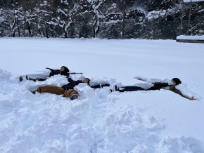 中学生は英語の授業の半分を使って雪遊びをしました。中1は激しい雪合戦で写真が撮れませんでしたが、中2と中3は「写真、撮ってくださ〜い!」とリクエストがありました。選りすぐりの写真を紹介します!