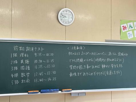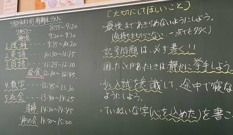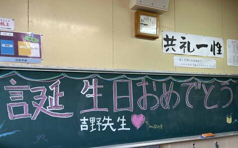 今週はテスト週間です。朝の早い時間帯に中学校の各教室を覗くと、テストの時間割と注意事項に加えて、「最後まであきらめない!」のメッセージが黒板に綴られていました。ところが、中学2年生の黒板には大きな文字で「誕生日おめでとう」のメッセージが!! 実は今日は担任の吉野先生の誕生日。「〝誕“の右側の文字は私が書きました!」、「文字の上の飾りは僕が描きました」と、クラスのみんなで分担して書いてくれたようです。みんなのあたたかいメッセージのおかげで、試験期間のピリピリッとした空気が和みました。