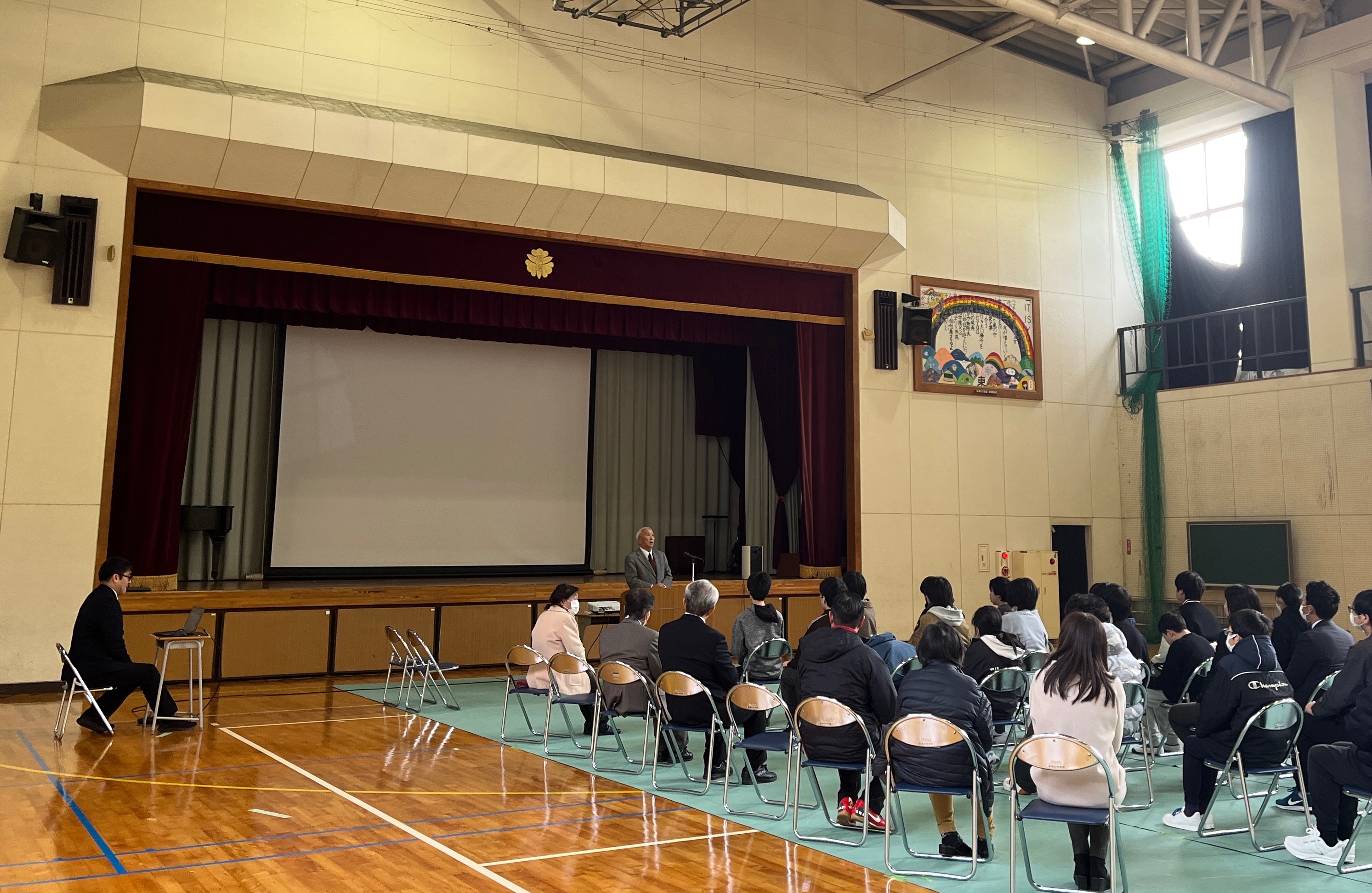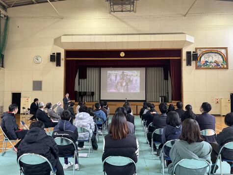 語る会の第一部は懐かしい写真をスクリーンに映しました。野球ができるようにグラウンドを整えたり、地域の人たちと一緒に掃除や草取りをしたり、西濃学園の校歌をプロデュースしてくれたマーク・パンサーさんと餅つきをしたり(?!)、その時代を知らない生徒や職員も興味深そうに写真を見ては、西濃学園中学校の思い出話に耳を傾けていました。