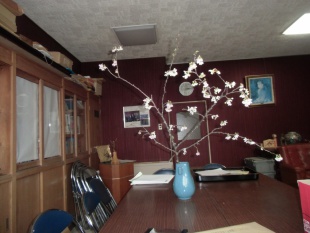 1月下旬、職員のMさんが。雪で折れた桜の枝を持ってきてくれました。私の部屋の花びんに入れ花が咲くかなと毎日見守っておりましたところ、枝から芽が出て、そしてつぼみが膨らみ見事咲きだしました。3月6日は卒業式、まずは私の部屋の春の訪れを卒業生の一人ひとりと楽しみたいと思っております。