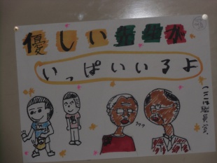 昨日の美術の時間、校内にポスターを貼ろうということで、各々の生徒が取組ました。職員室、憩いの間の扉、トイレ、階段、食堂、生徒用玄関と思い思いの作品が貼られました。タイトルのポスターは職員室の扉に貼られました。「優しい先生がいっぱいいるよ」これは私ども教職員が優しいという意味と、もっと優しくして欲しいとの両方の意味があるのかなぁ~と考えさせられました。