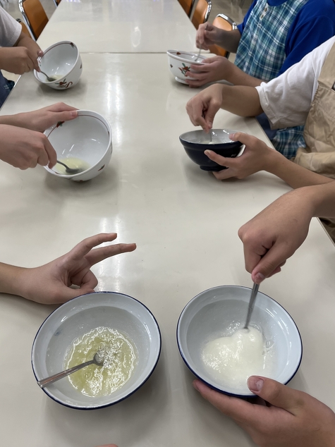 本日の中学2年生の家庭科の授業はごまチュイール作りでした。チュイールとはフランス語で瓦という意味。形が瓦のようにカーブ状になっていることから名付けられたそうです。