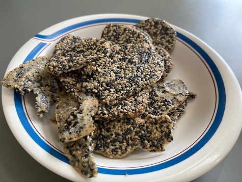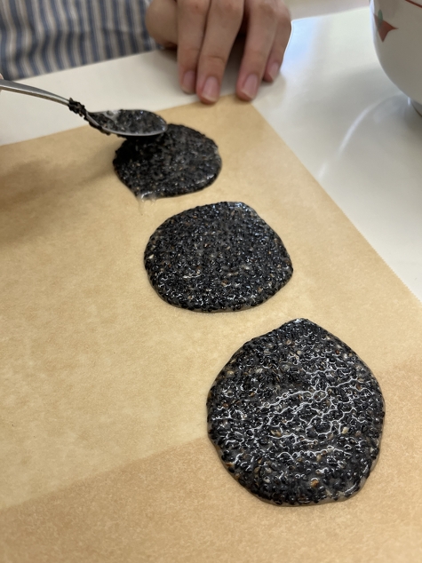 材料は卵白と砂糖、小麦粉、溶かしバター、黒ごまと白ごまのみ。どんぶり茶碗に材料を順番に入れて混ぜ合わせたら、鉄板に生地を流し、オーブンで焼きます。生地を焼いている間に片付けを済ませ、何とか帰りの会までに間に合わせることができました。中2の愛を込めたごまチュイールは中3と中1のクラスのみんなにもお裾分け。もちろん、職員もいただきました。コーヒーが飲みたくなる香ばしいクッキーで、とても美味しかったです。ごちそうさまでした。