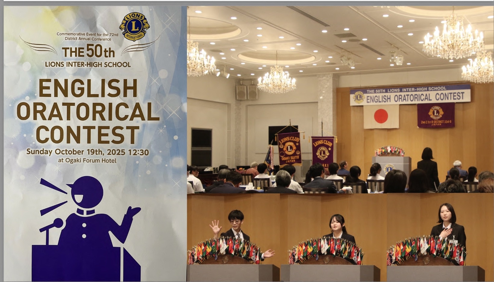 「English Oratorical Contest(英語弁論大会)」は、ライオンズクラブ主催の伝統ある大会です。第50回を迎えた記念すべき大会が大垣フォーラムホテルで実施され、西濃学園の高校1年生が3名参加しました。西濃学園を含め、近隣の公立・私立高校9校から計24名が参加。今回は「戦争と平和」というテーマに沿って、参加者が観衆に熱い想いを語ってくれました。