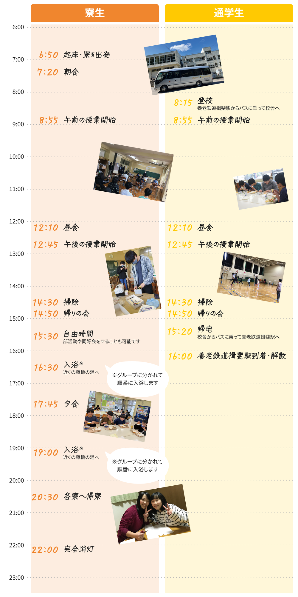 | 6:50 | 起床 7:20の朝食に間に合うように寮を出発し、校舎へ向かいます。 |